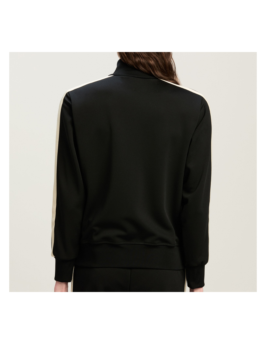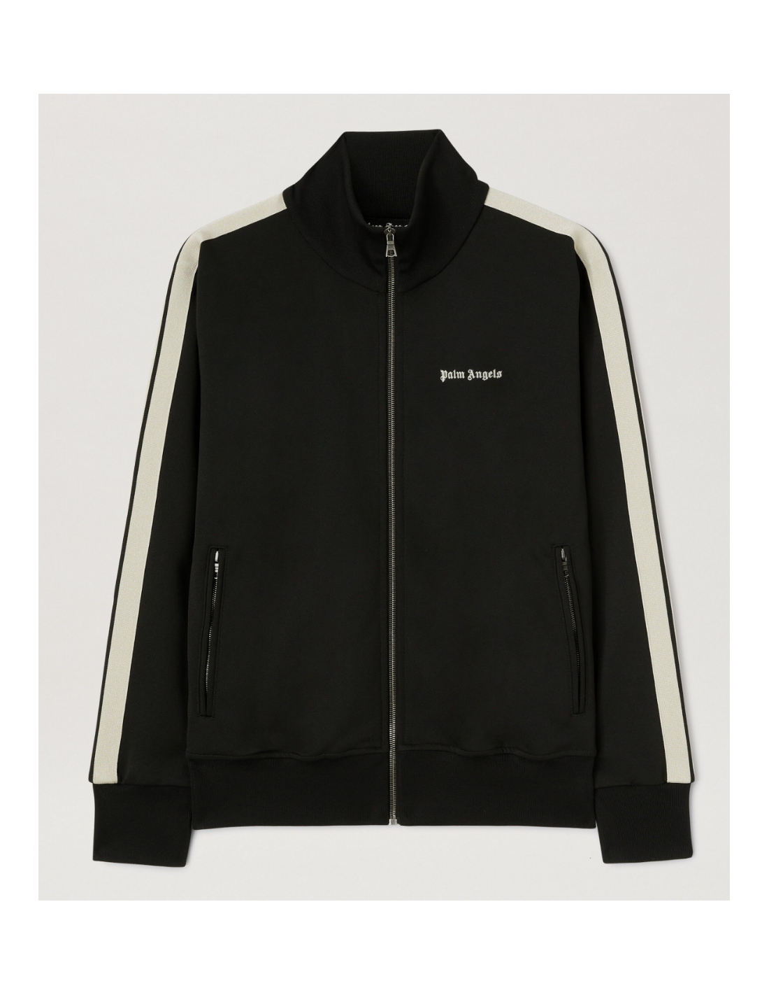 Giacca Palm Angels Track Jacket nera con bande laterali bianche. Realizzata in poliestere tecnico di alta qualità, presenta chiusura frontale con zip a doppio cursore, due tasche laterali con zip e collo alto a costine. Il design minimal è arricchito dal logo Palm Angels ricamato sul petto, mentre le bande a contrasto sulle maniche donano un tocco sportivo e distintivo. Ideale per un look casual streetwear o per completare outfit sporty-chic. Vestibilità regolare